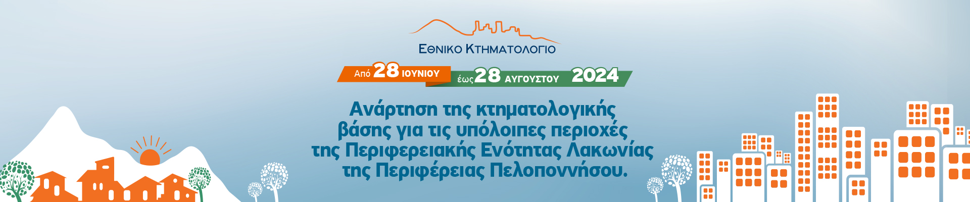Σας ενημερώνουμε ότι 28/06/2024-28/08/2024 (ή 29/10/2024 για κατοίκους εξωτερικού) θα πραγματοποιηθεί στην ιστοσελίδα ktimatologio.gov.gr ηλεκτρονική Aνάρτηση στις υπόλοιπες περιοχές της Π.Ε.Λακωνίας. Με χρήση κωδικών taxisnet μπορείτε να επικαιροποι... -